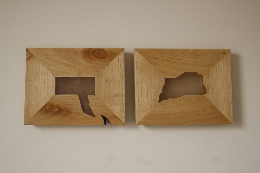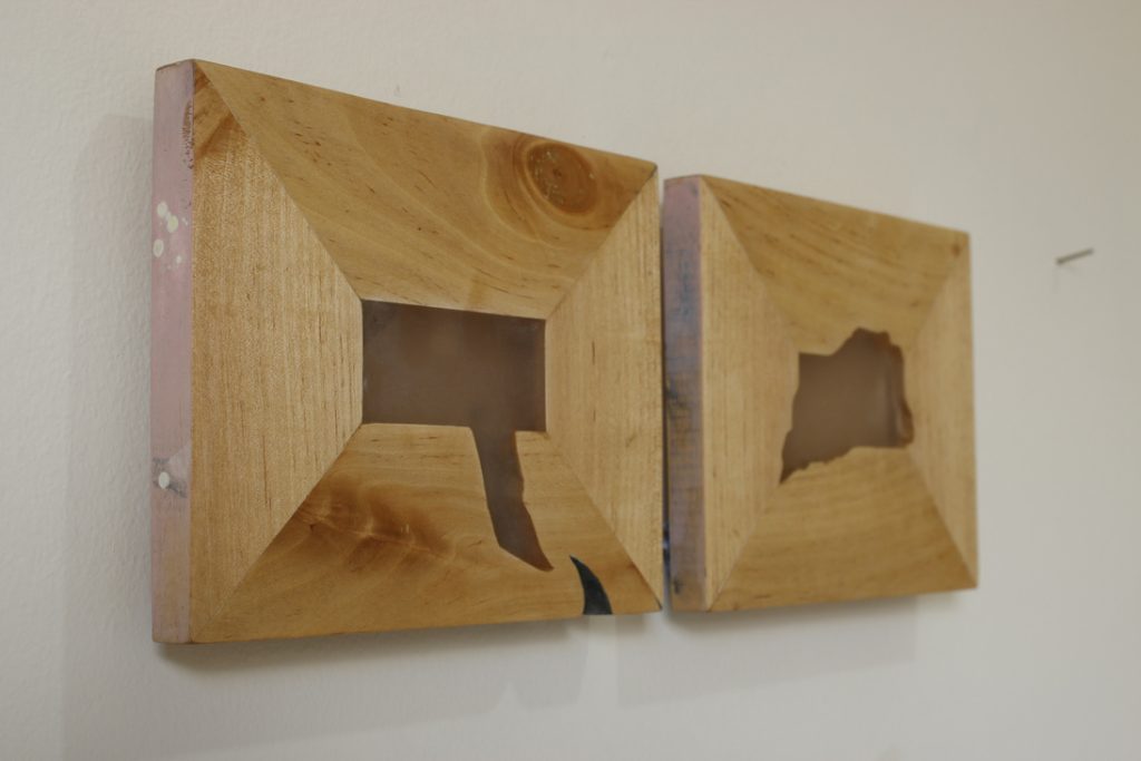 Boşluk / Karşılaşma Emptiness /Encounter Karışık teknik (hazır çerçeve ve ayna),2021, 40×40 cm. Mixed media( ready frame and mirror), 2021, 40×40 cm. Karışık teknik (hazır çerçeve ve asetat), 2021, 14×10 cm. Mixed media( ready frame and acetate), 2021, 14×10 cm. Elle yontulmuş ağaç, polyester ve matbaa boyası, 2018, 15,5 x20 x1,8 cm (2 adet).Hand sculpted wood and digitally printed plexiglass shaping, 2018, 15,5 x20 x1,8 cm (2 pieces).